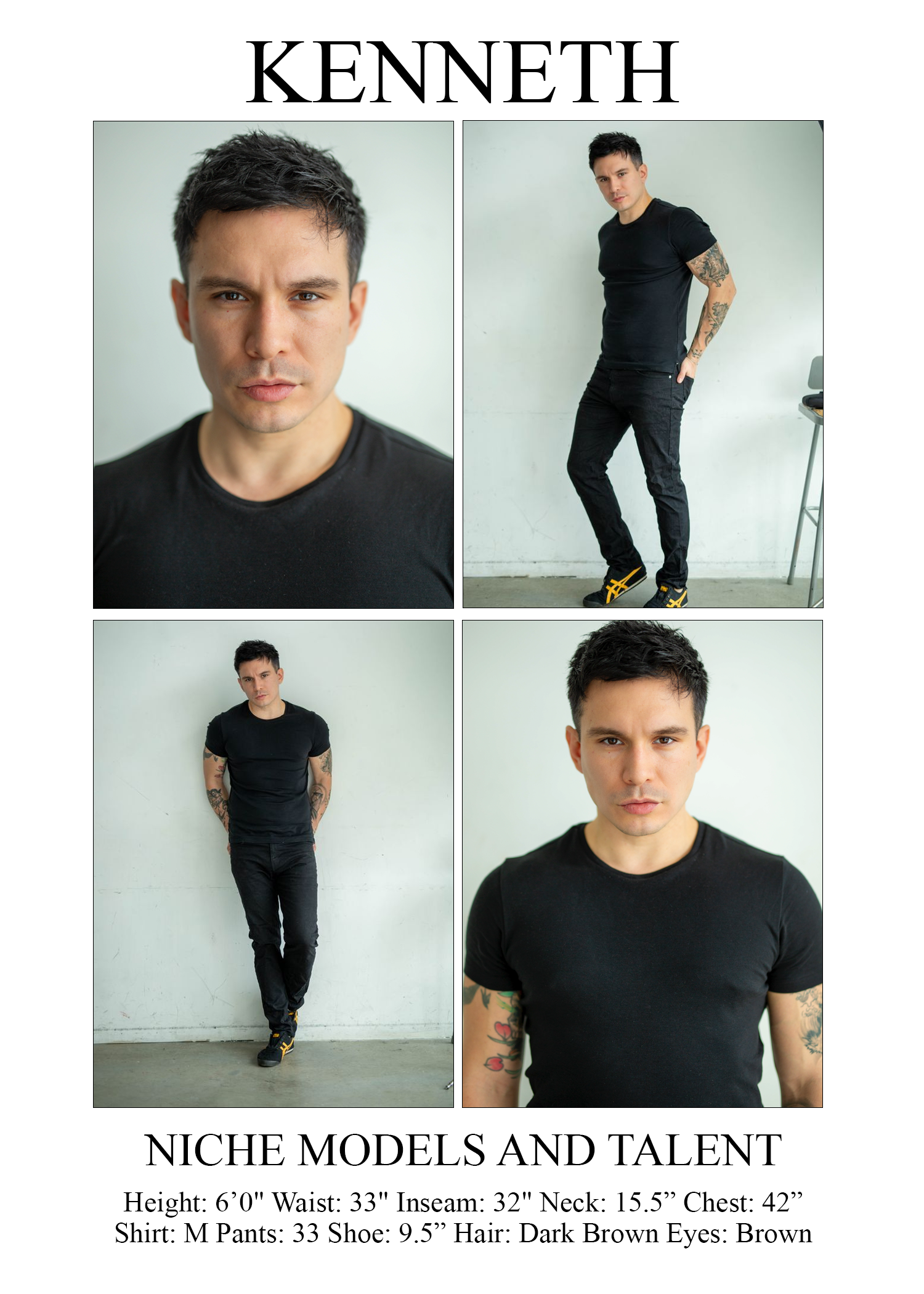 Height: 6’0" Waist: 33" Inseam: 32" Neck: 15.5” Chest: 42” Shirt: m Pants: 33 Shoe: 9.5” Hair: dark brown Eyes: brown