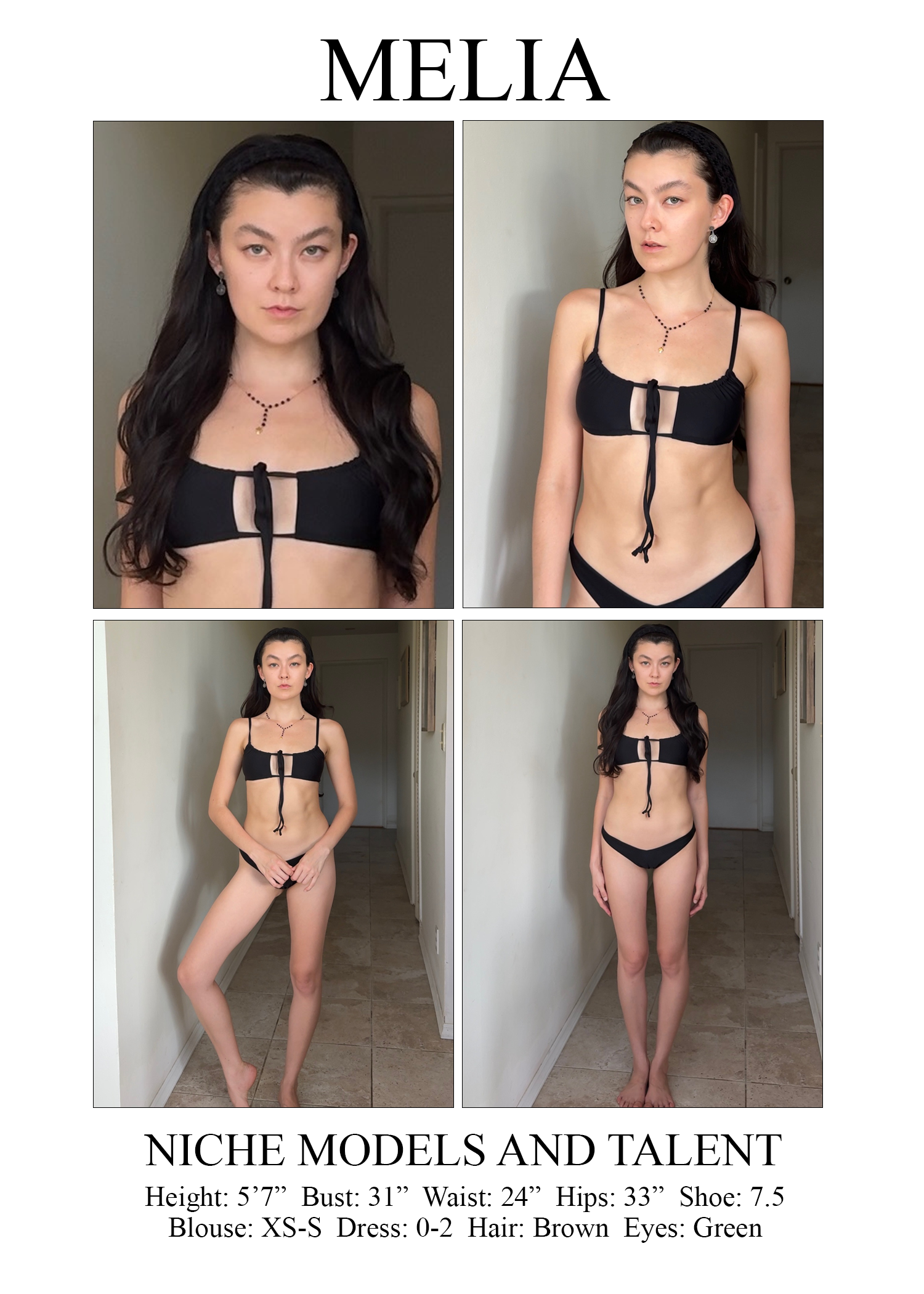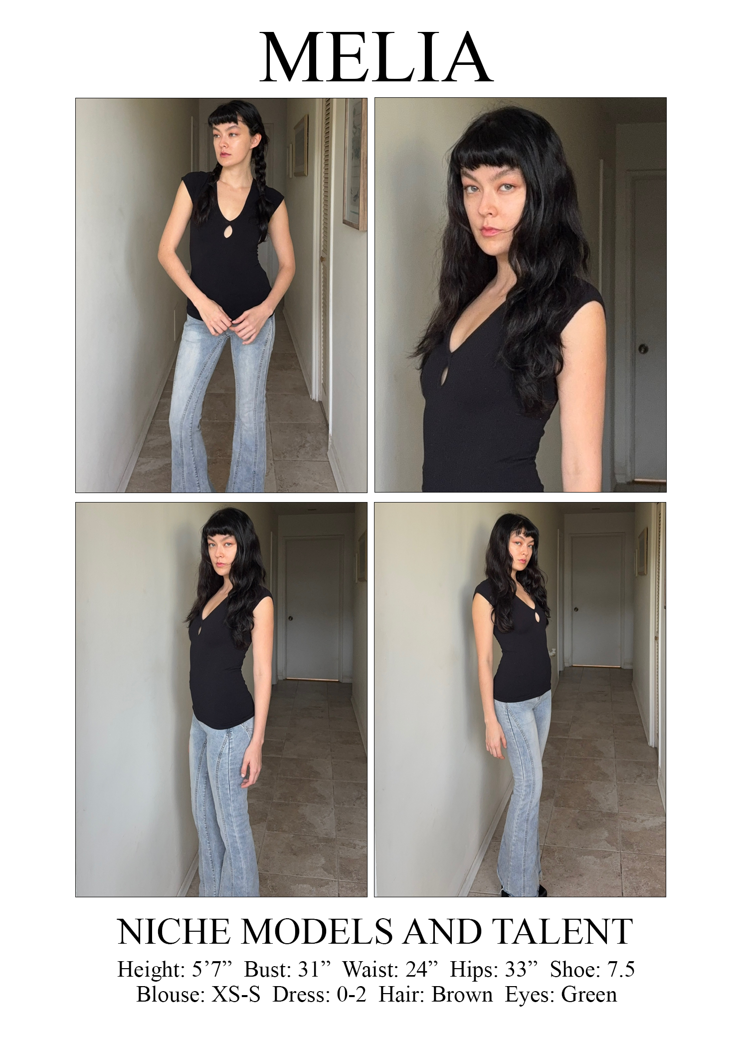 Height: 5’7” Bust: 31” Waist: 24” Hips: 33” Shoe: 7.5 Blouse: Xs-S Dress: 0-2 Hair: Brown Eyes: Green