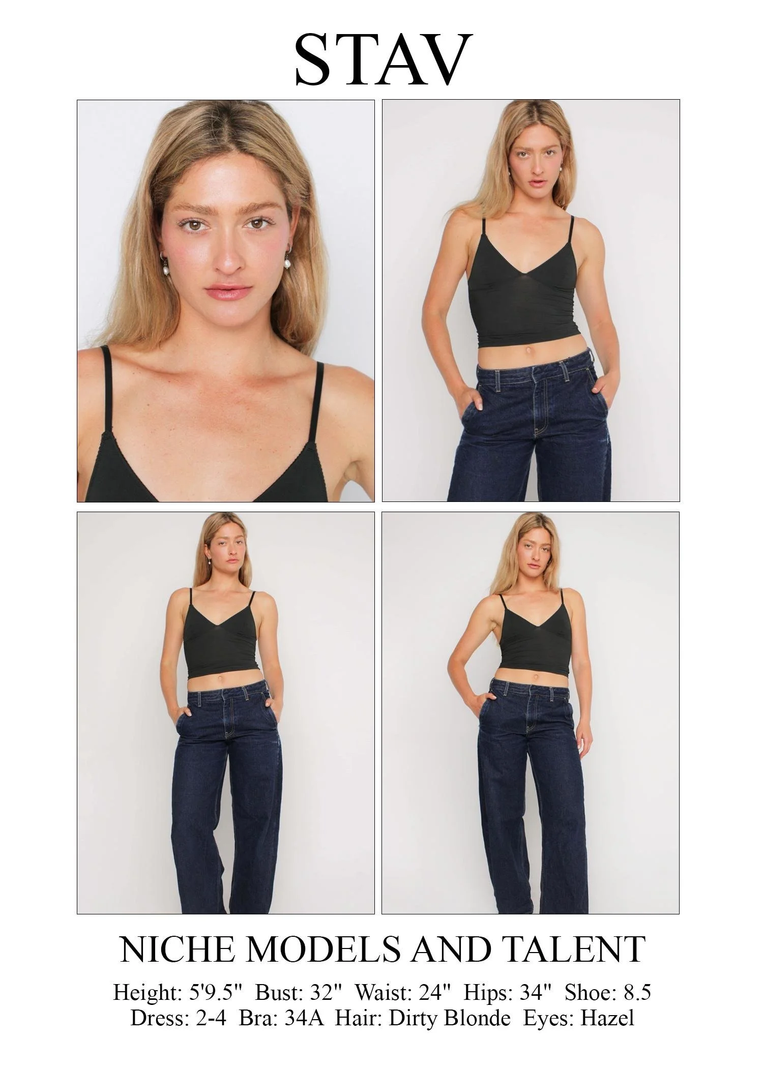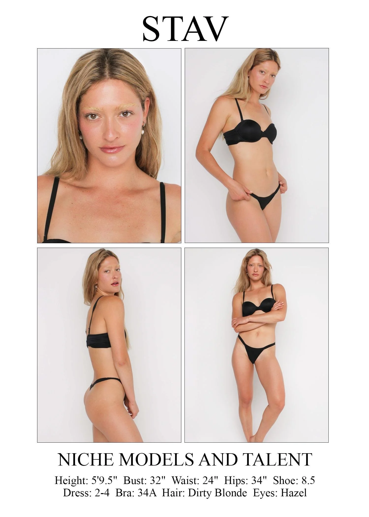 Height: 5'9.5" Bust: 32" Waist: 24" Hips: 34" Shoe: 8.5 Dress: 2-4 Bra: 34a Hair: dirty blonde Eyes: hazel
